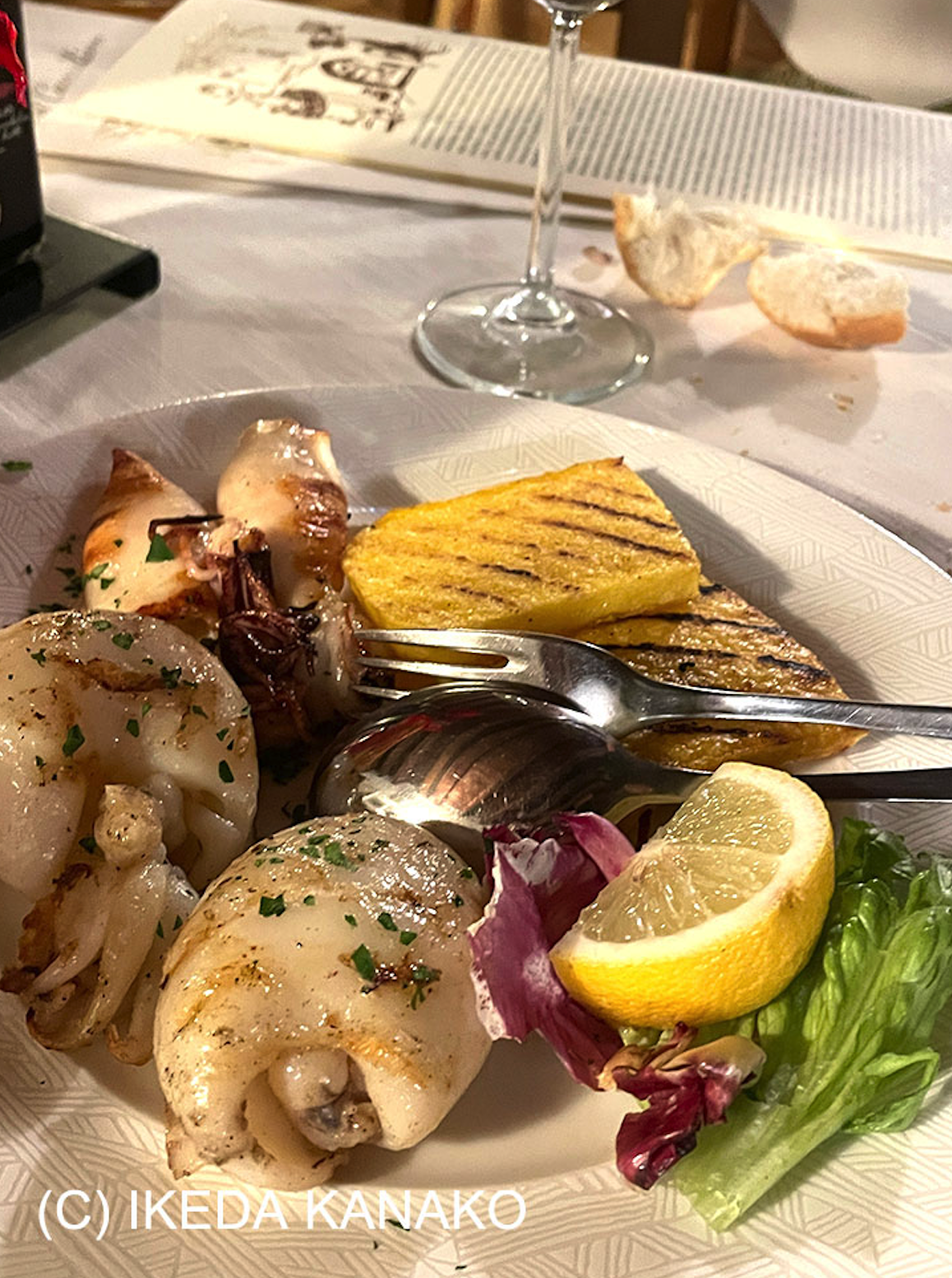 ポルトグルアーロはなんといっても海から近いので、お魚料理がとっても美味しい。こちらではソースとかかけないで、あえて素材の味を生かすシンプルな味付け。新鮮なイカがぷりっぷり!プロセッコという、地元のスパークリンワインと合わせます。