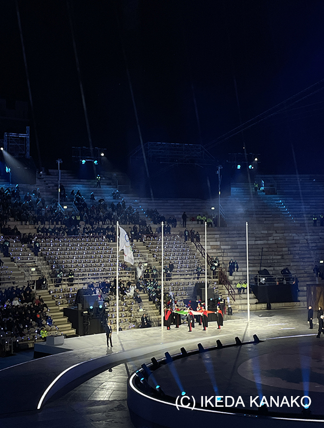 他にも、「メローニ首相のご登場」という本人はいないけど紹介シーンだけやるところを見れたり、これは本番で本当にあるのか分からないけど、最終競技のメダルセレモニーの練習もやっていて、仮の選手名がフランス代表ケセラセラさんや、日本の金メダルがライオタハイロウシーとか、何その名前と笑っちゃうような名前ばかりで、全然違う国旗を揚げたりしていて、ちょっとしたジョークみたいで面白かったです。