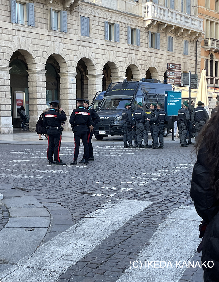 警備体制もかなり強化。軍警察のカラビニエリ、普通の警察ポリス、迷彩模様のユニフォームを着た軍隊が至る所に。人員を増やすために近隣からもヘルプが来たのかな。